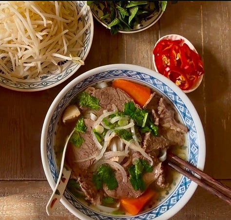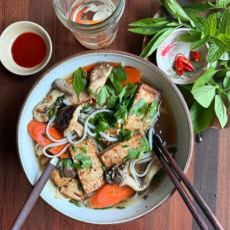 Wok-Kissed Pho with Beef and its kin, the tofu-mushroom version, are super takes on a northern Vietnamese pho. The easy cooking methods yields fabulous, deep flavors. You rarely find this pho outside of the Hanoi area but every pho lover should know about it!