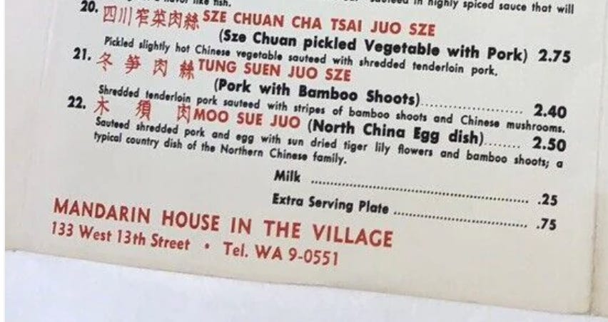 Kwoh opened Mandarin East and Mandarin House in the 1950s. Below is a vintage menu from Kwoh’s restaurant with “moo sue juo” (for moo shu rou) but without the pancakes — yet. The New York Times eventually credited Kwoh as being one of the first to serve moo shu with pancakes at Mandarin House.