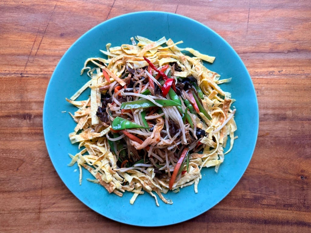 Finally, the third character 肉 refers to ròu — meat, which in China and Vietnam, defaults to pork. Traditionally the dish was prepared with pork, egg, earthy bamboo shoot, frilly crunchy black fungus mushroom, and aromatics and simple seasonings. It was a homey stir-fry that people whipped up to eat with rice.