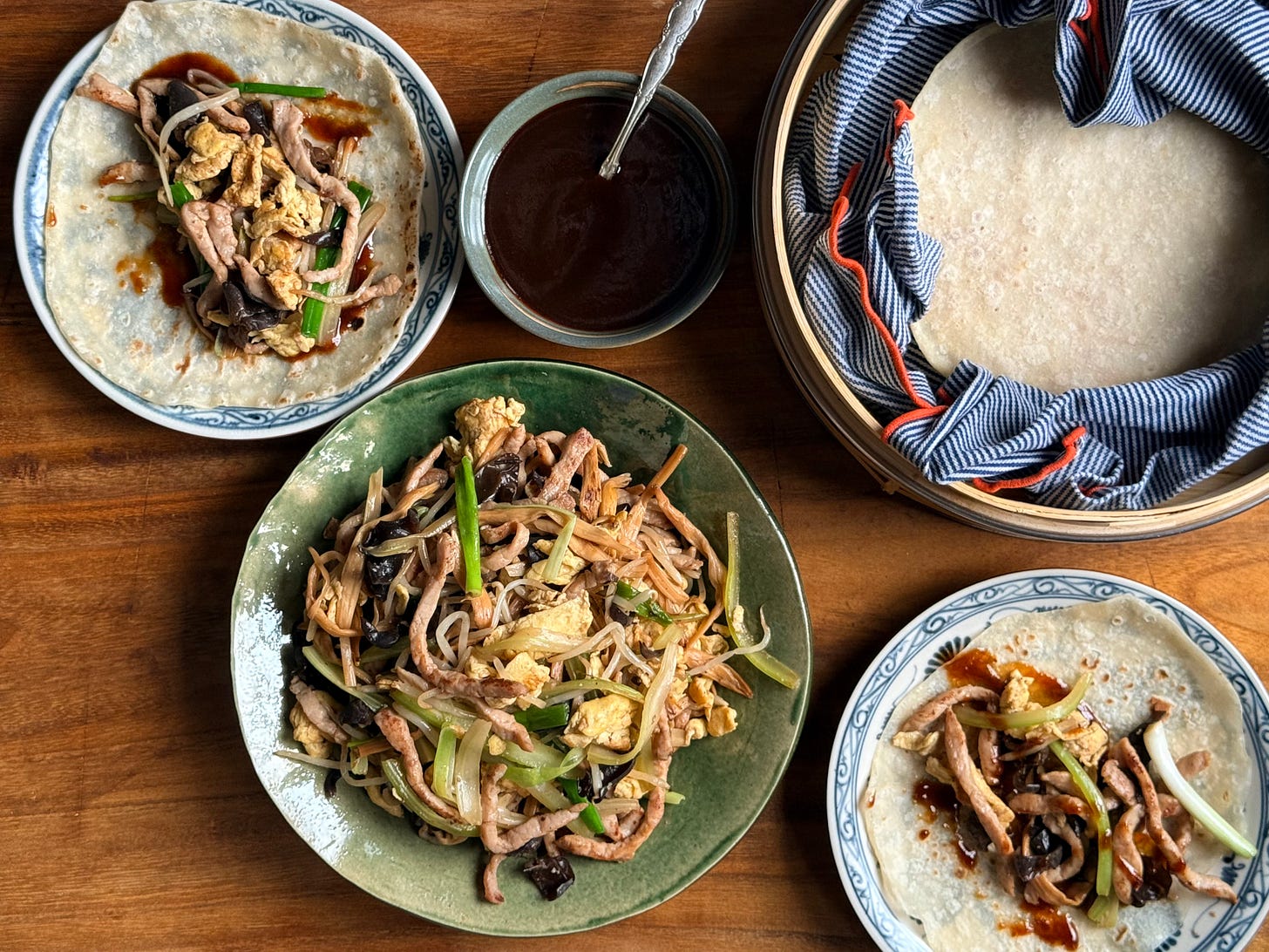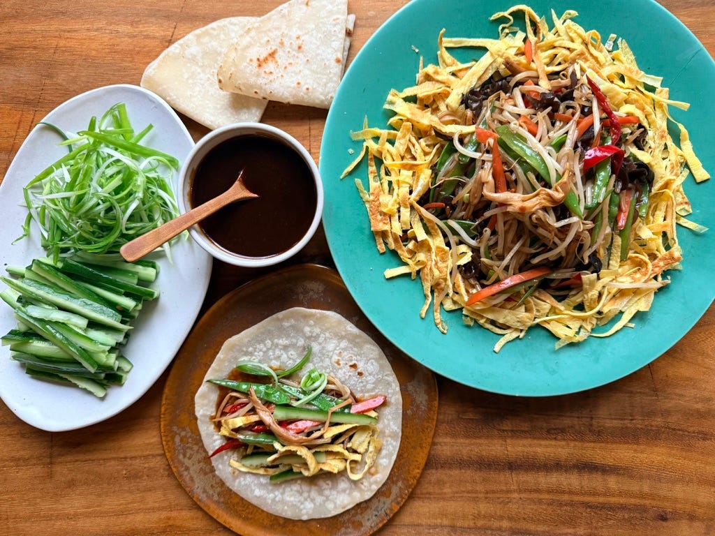 Last weekend, for a gateway experience, I led with my Mandarin pancakes mini class plus shortcut duck recipes. Then at midweek I followed up with a homemade Peking duck recipe, in case you want your pancakes to wrap around something super duper and ultra impressive. Today, let’s moo shu with the pancakes!